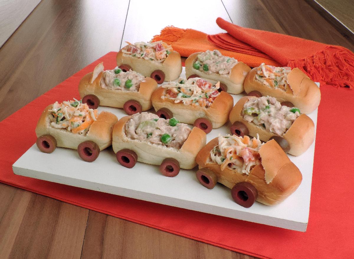 Use azeitonas ou tomates cereja como “faróis” e enfeite com uvas-passas ou pedacinhos de pimentão para dar mais cor e charme. Se desejar, o primeiro vagão pode ganhar uma “chaminé” feita com palito e uma rodela de pepino.